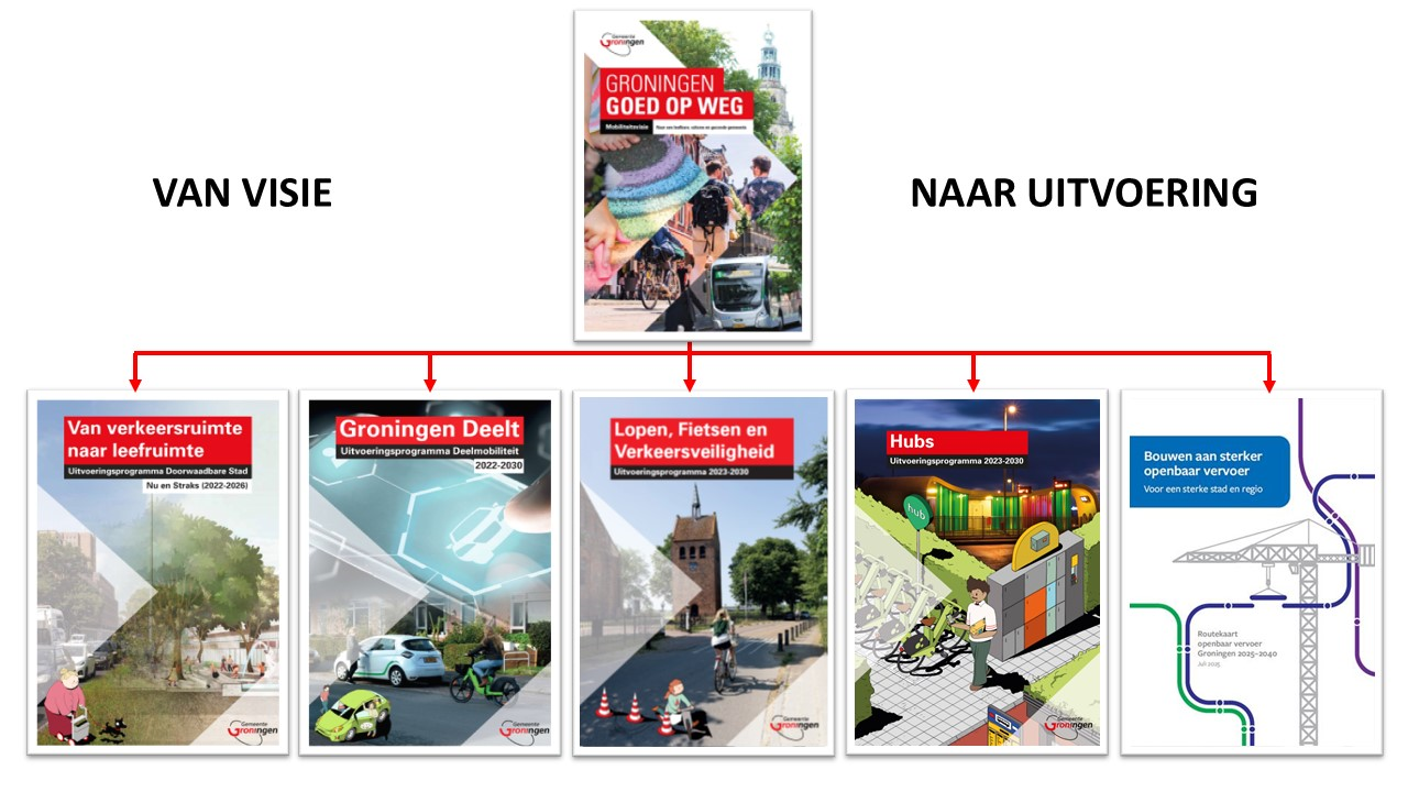 Het aantal inwoners, arbeidsplaatsen en bezoekers in Groningen groeit. En als gevolg daarvan ook de mobiliteit in en naar onze gemeente. Daardoor wordt het steeds drukker op straat en lopen we ook vaker tegen de grenzen van onze mobiliteit aan. Om te voorkomen dat het welzijn van onze inwoners hier negatief door beïnvloed wordt, geven we lopen, fietsen en het openbaar vervoer prioriteit. In onze Mobiliteitsvisie hebben we daarom bepaald dat schone, ruimte-efficiënte en gezonde vormen van mobiliteit én de kwaliteit van de openbare ruimte leidend zijn bij het maken van keuzes. Zo maken we onze straten en pleinen leefbaarder en aantrekkelijker.