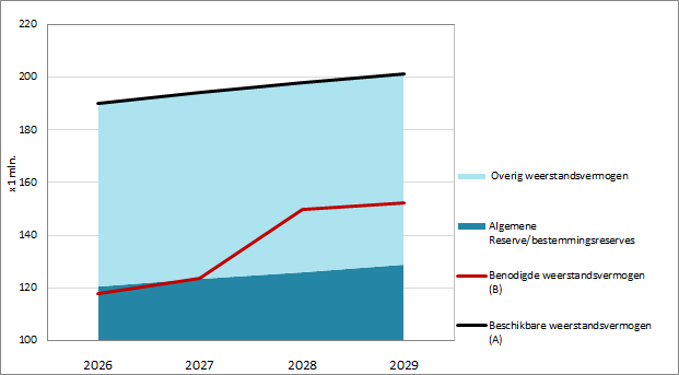 In vergelijking met de jaarrekening neemt het benodigd weerstandsvermogen toe met 5,8 miljoen euro. Het beschikbaar weerstandsvermogen neemt toe met 3,7 miljoen euro. Dit leidt in 2026 tot een verslechtering van de ratio met 5% (van 166% naar 161%).
